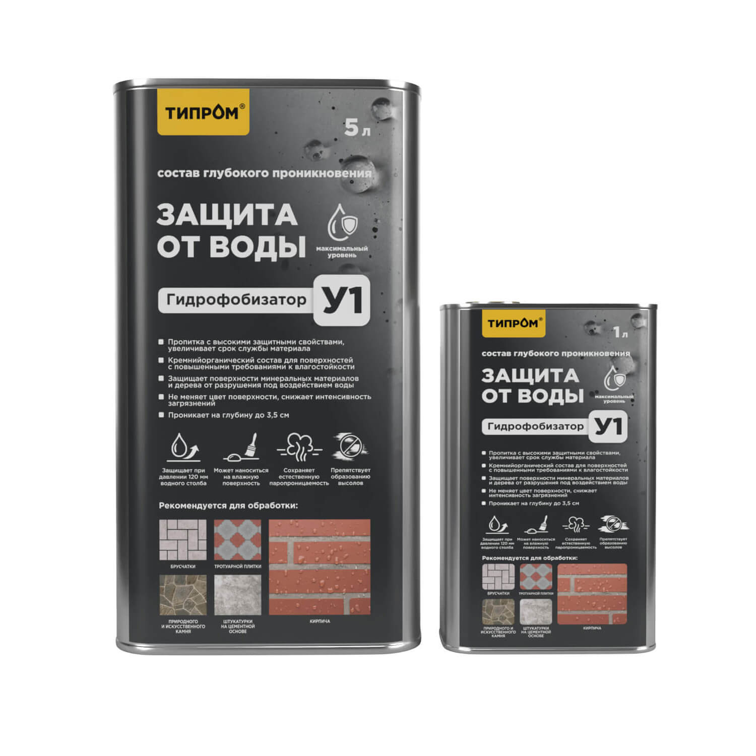 Среди продуктов серии Типром гидрофобизаторами для тротуарной плитки и брусчатки являются составы Типром У и Типром У1, а также Типром М (пропитка с «мокрым эффектом и гидрофобизирующими свойствами»).