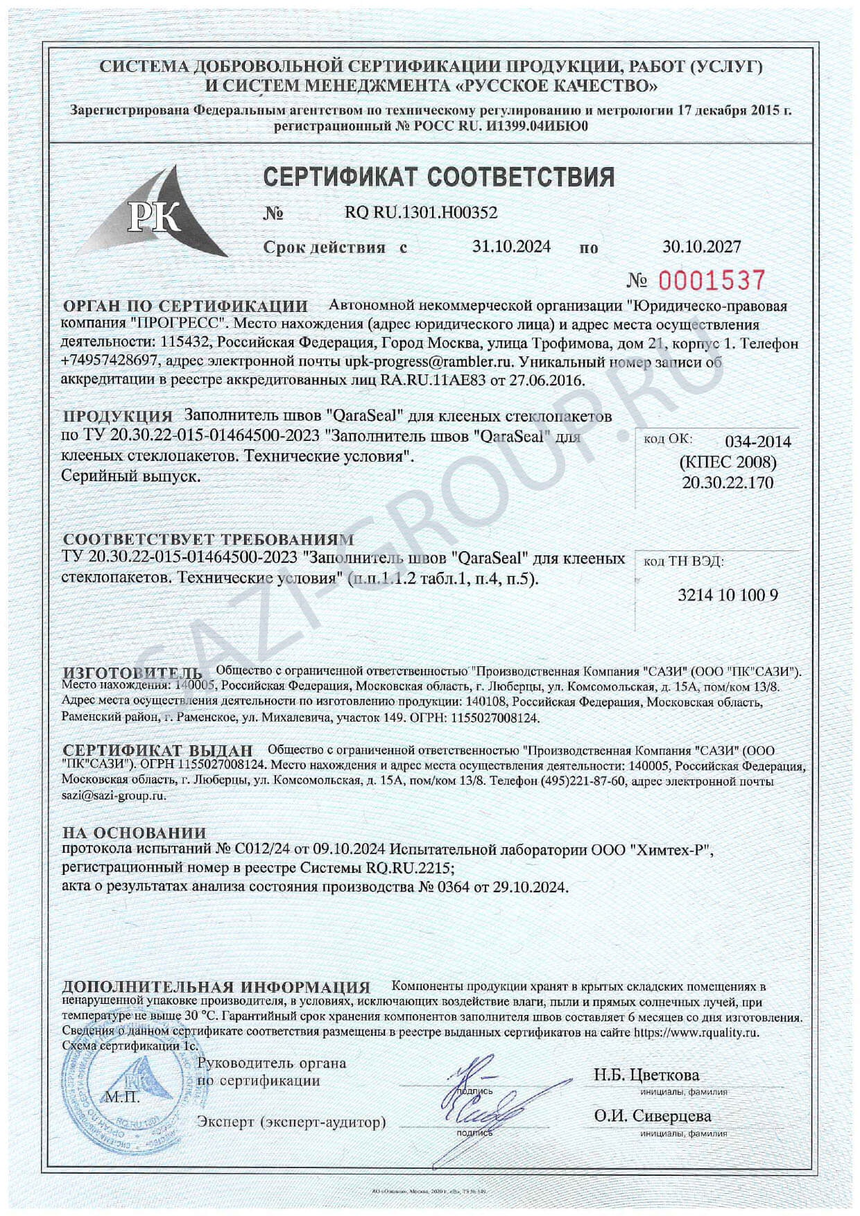 • Сертификат соответствия Сертификат соответствия QaraSeal Сертификат соответствия QaraSeal